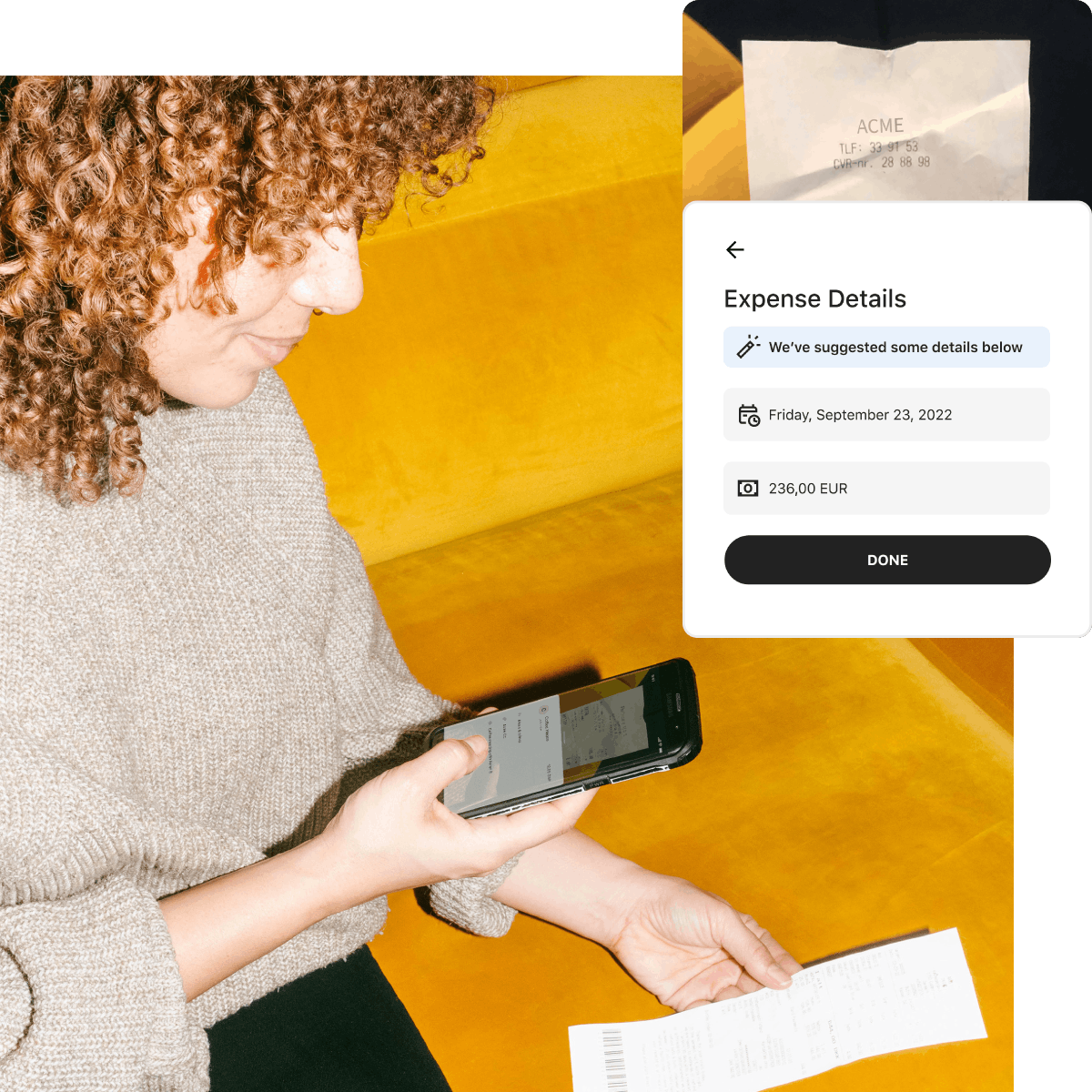 When we say keep all receipts in one place, we mean it. Even employees who don’t need a Pleo card can be invited to do their reimbursements in the Pleo app. And it’s the same drill: Snap a picture, and get repaid.
