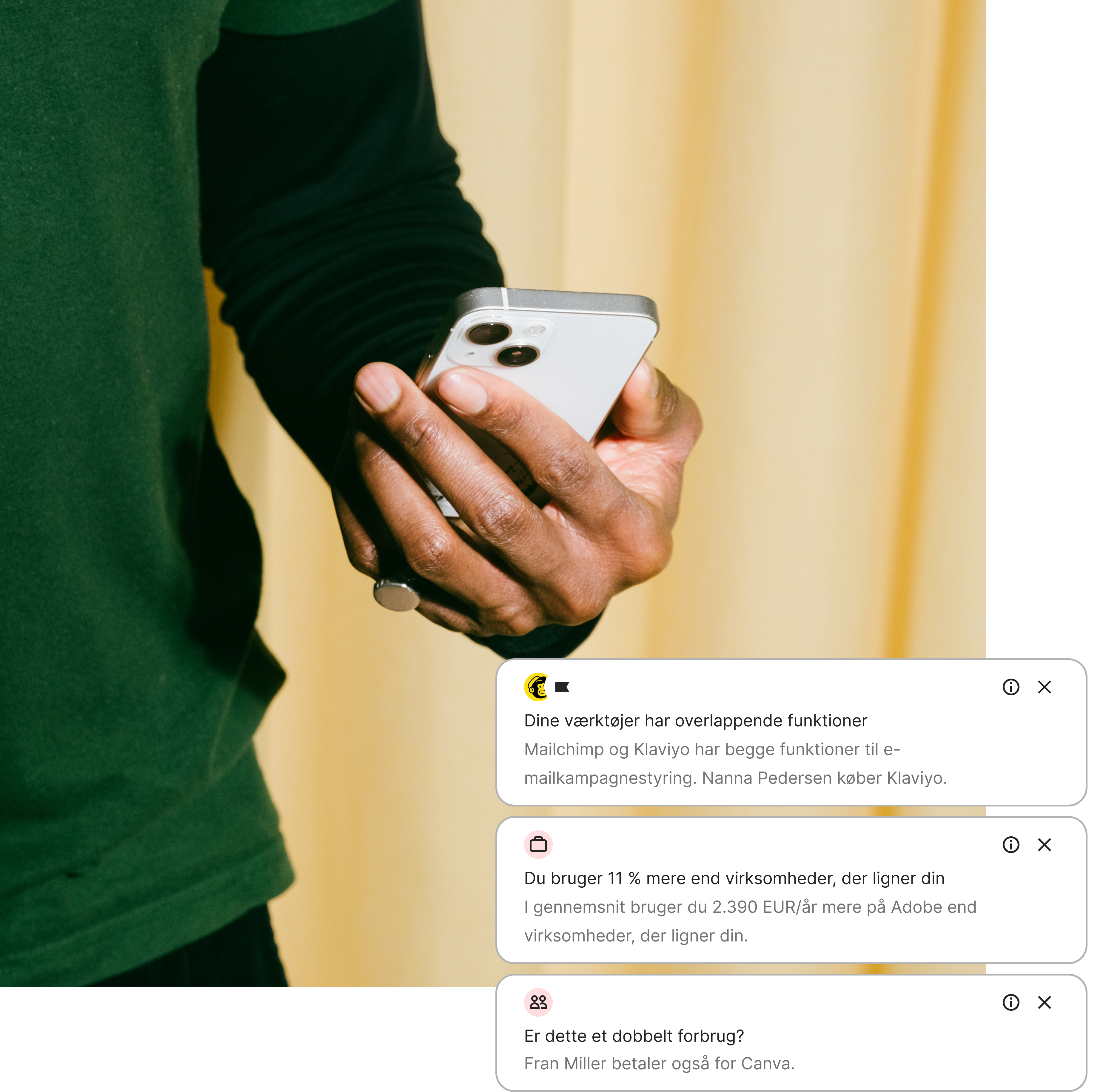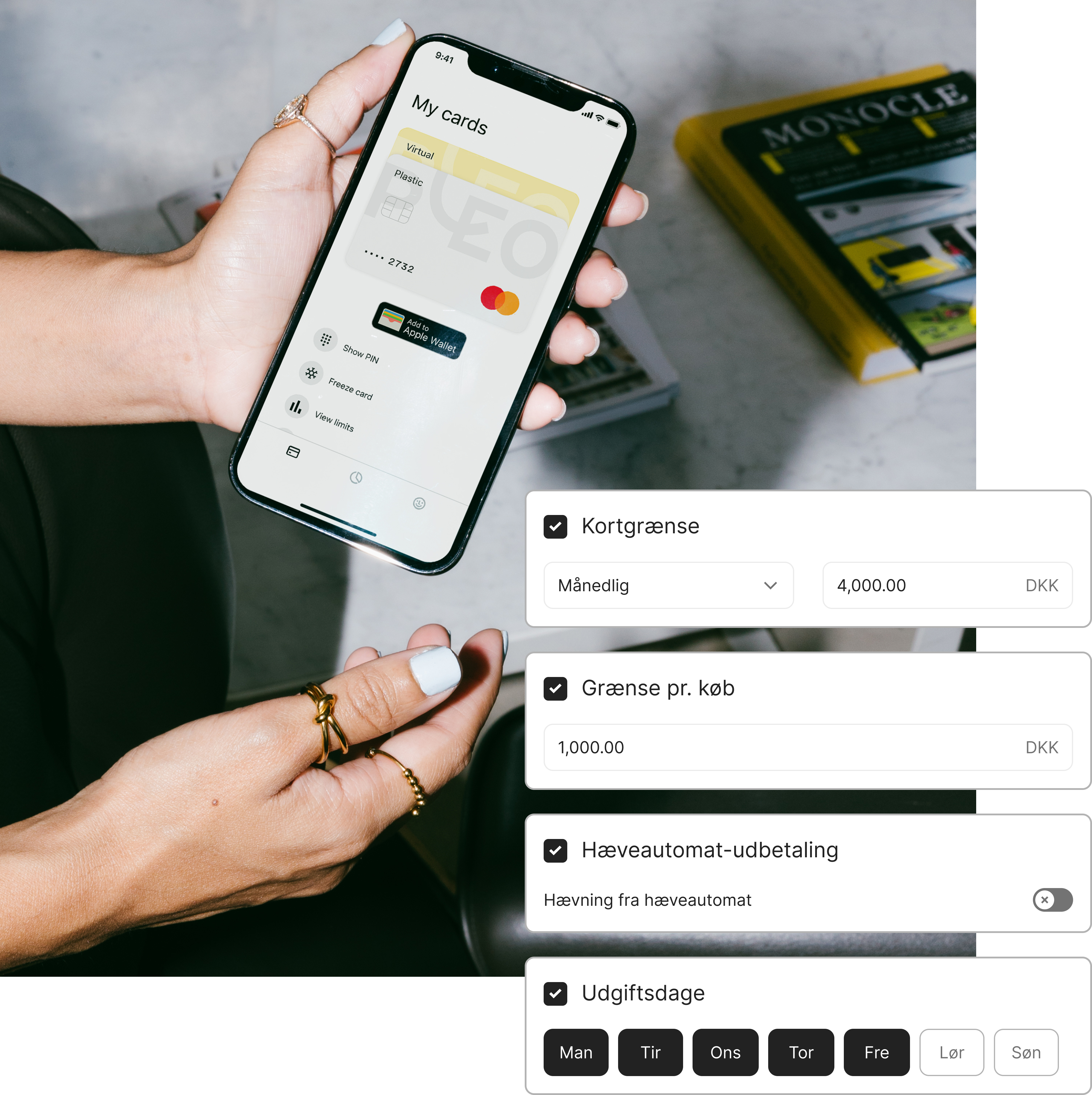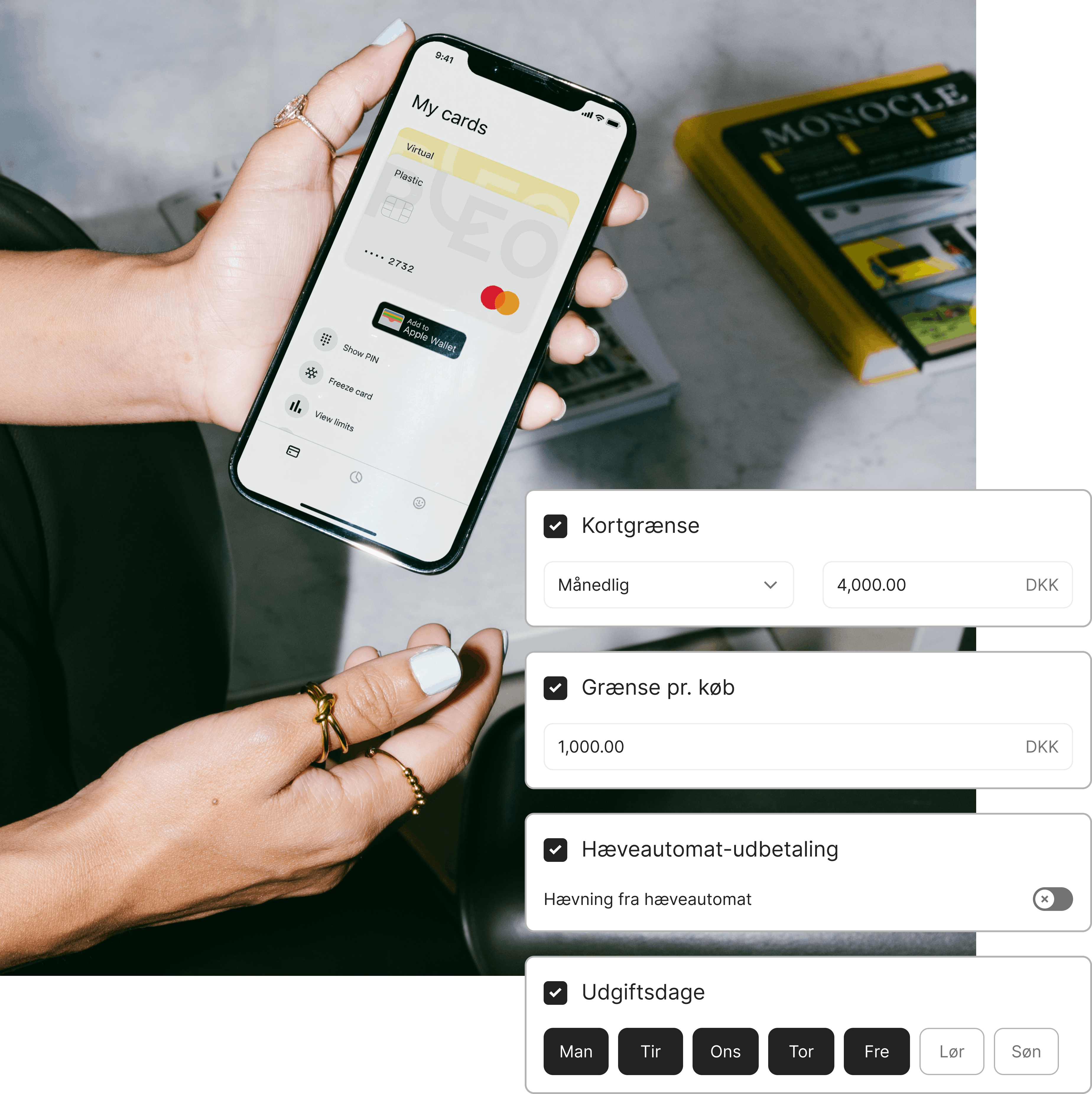 Udsted fysiske, virtuelle eller midlertidige kort på få sekunder til hardwareindkøb, abonnementer og alt derimellem. Der er ingen personlige udgifter involveret, og hver transaktion spores øjeblikkeligt i appen, hvilket sikrer komplet overblik og kontrol.