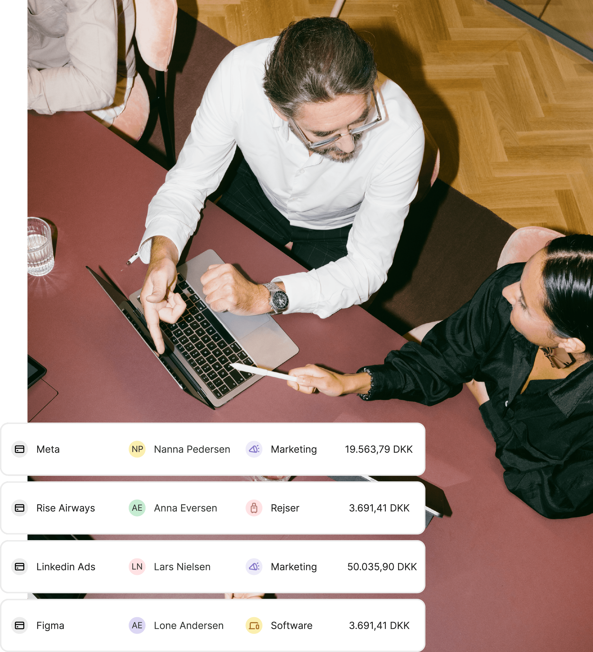 Bevar et komplet overblik over marketingudgifterne med forhåndsgodkendte budgetter og dedikerede leverandørkort. Centraliser alle udgifter, automatiser bogholderiet, og få en nem månedsafslutning.