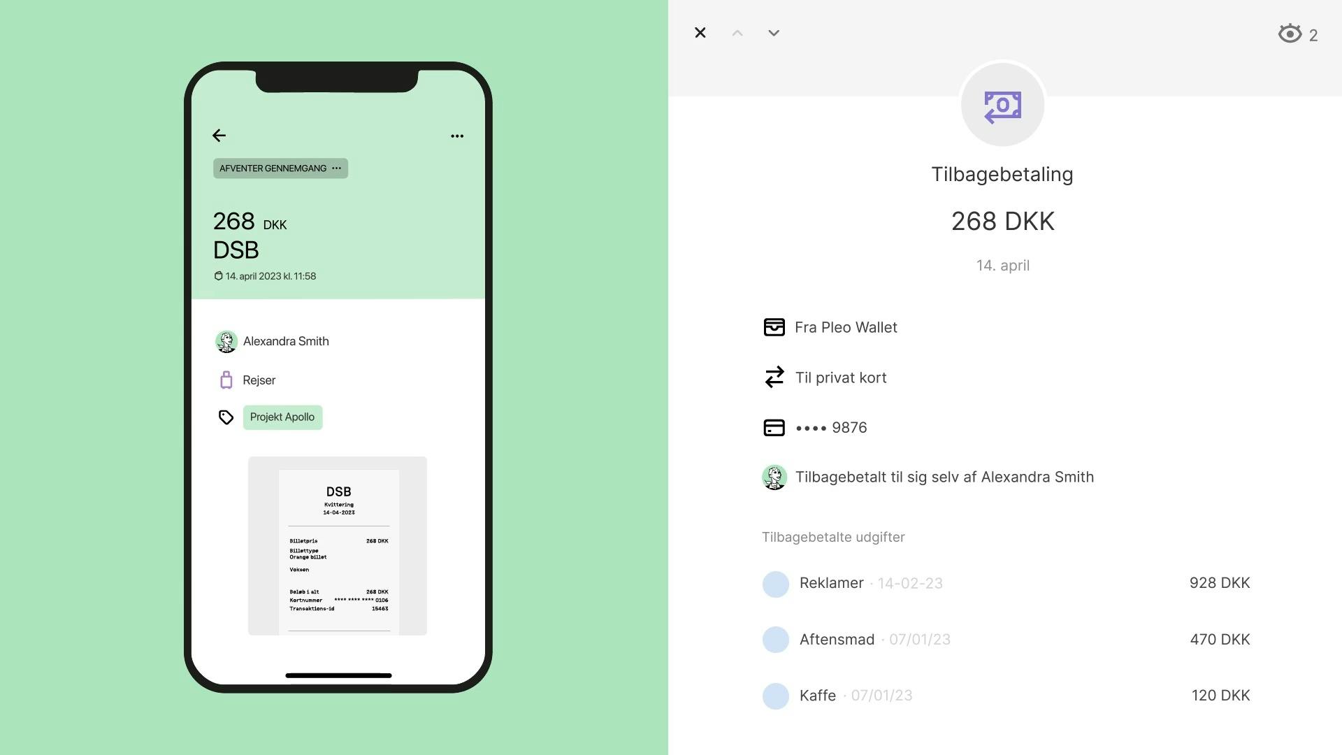 Du kan endda tilbagebetale medarbejdere via deres løn, hvis du vil. Registrer det i Pleo for at få overblik over alle dine tilbagebetalinger.