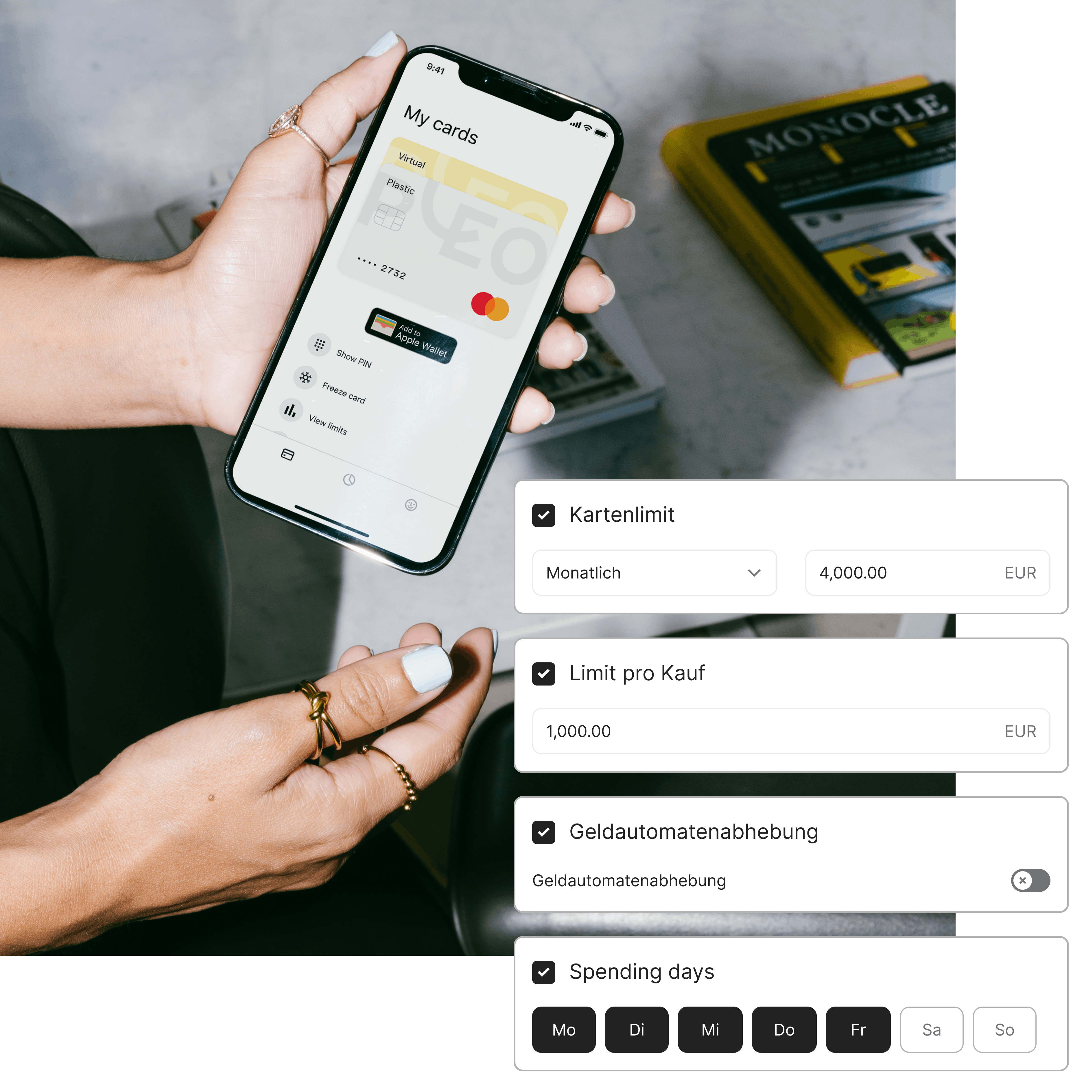 Stellen Sie physische, virtuelle oder temporäre Karten für Ihre Mitarbeiter:innen aus. In Sekunden. Privatauslagen werden unnötig, denn Hardware-Einkäufe, Abonnements und alle anderen erforderlichen Ausgaben lassen sich jetzt direkt tätigen. Stets im Rahmen klarer Kontrollmechanismen und sofort in der App einsehbar.