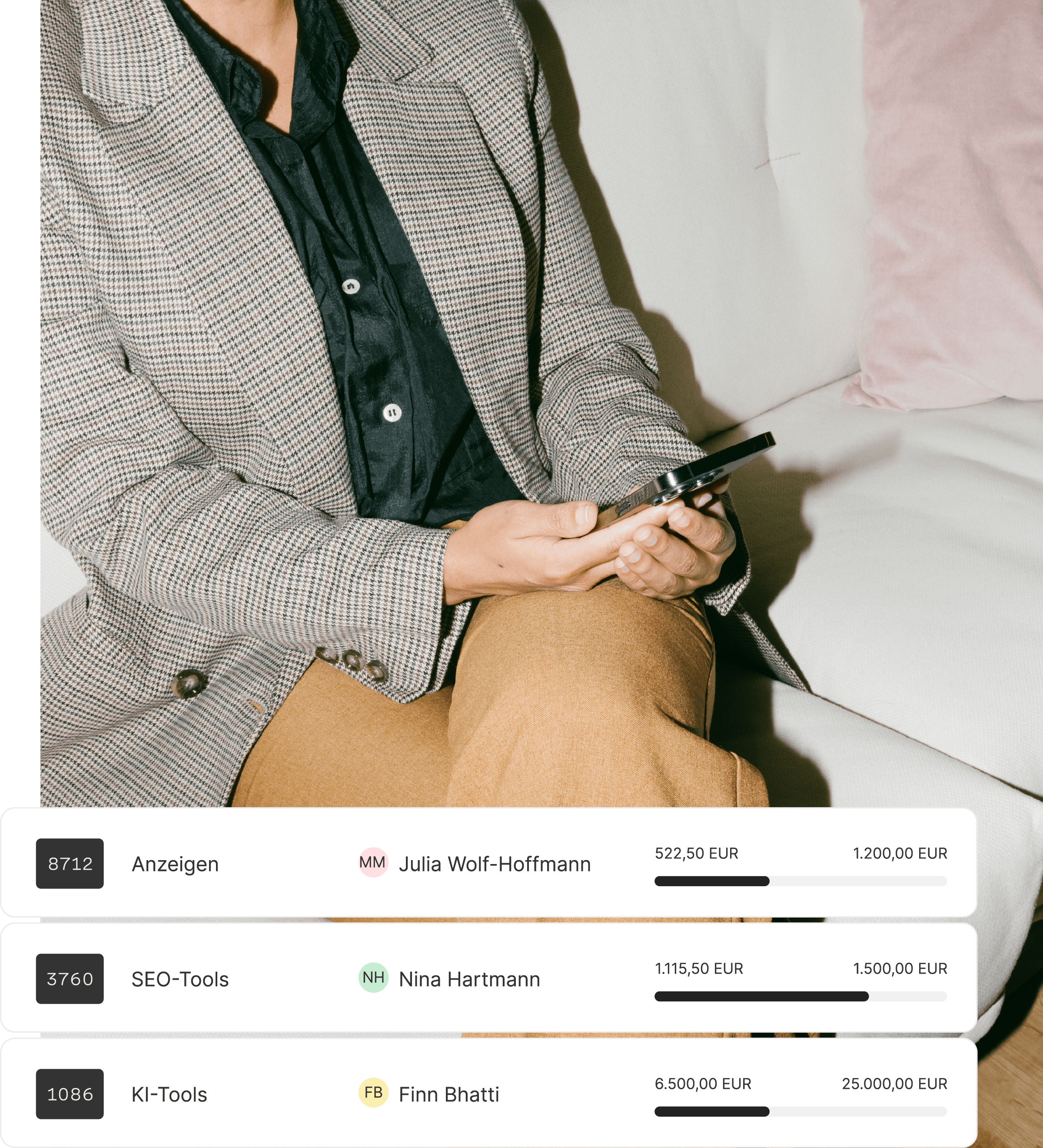 Minimieren Sie das Betrugsrisiko und maximieren Sie die Sicherheit. Nutzen Sie zweckgebundene Karten für Marketingausgaben und behalten Sie die volle Budgetkontrolle. Verlässt jemand das Unternehmen, können Sie die Karteninhaber:innen einfach wechseln, ohne dass Kampagnen oder Abos unterbrochen werden.