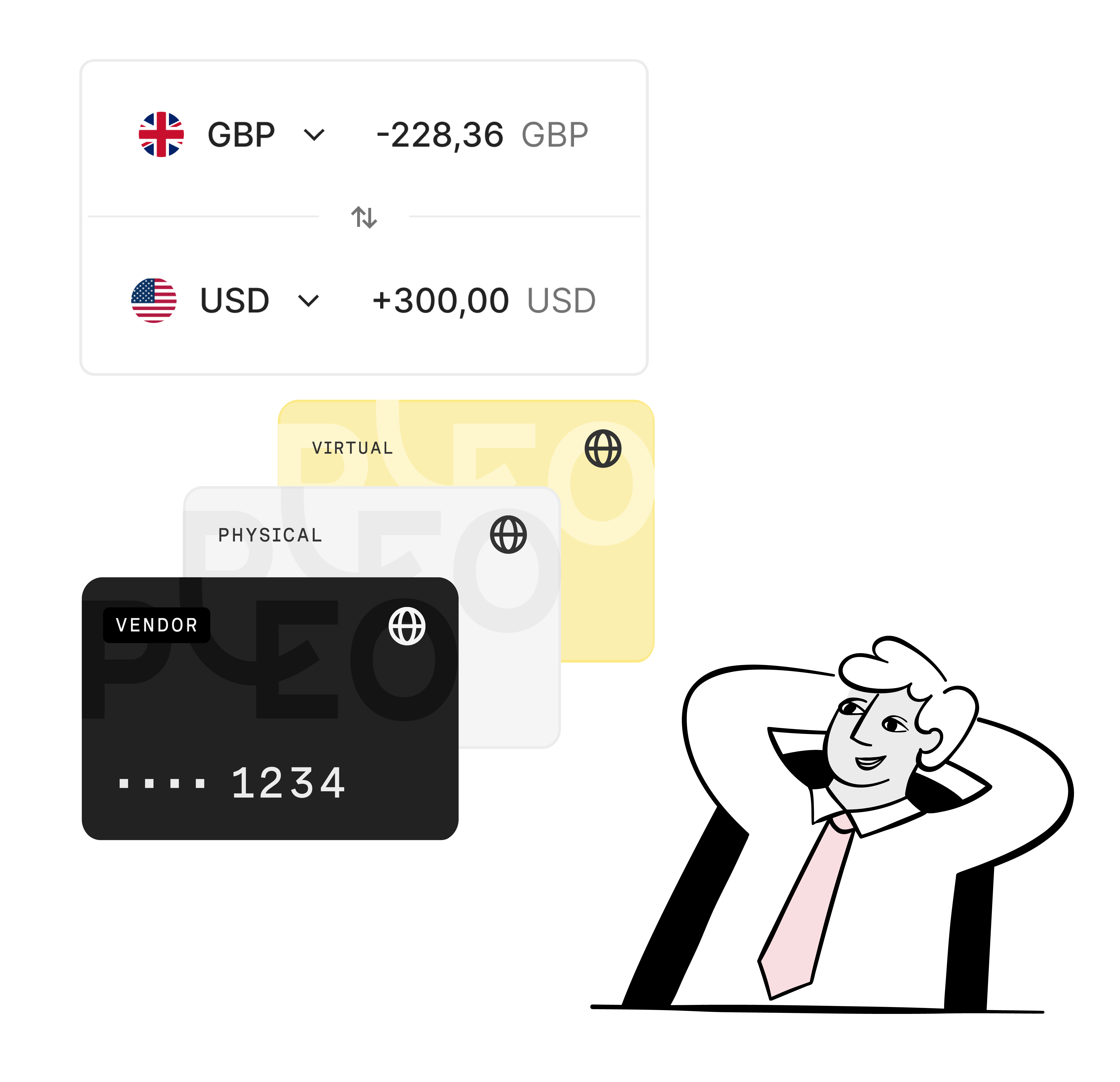 Hold and trade up to six currencies in the Pleo app. Spend globally with a single card that charges the right account automatically.
