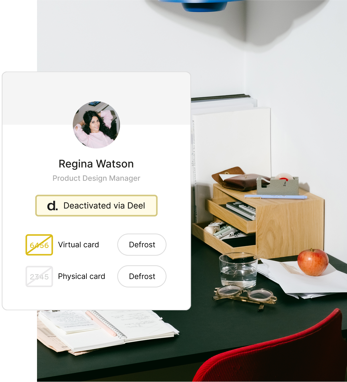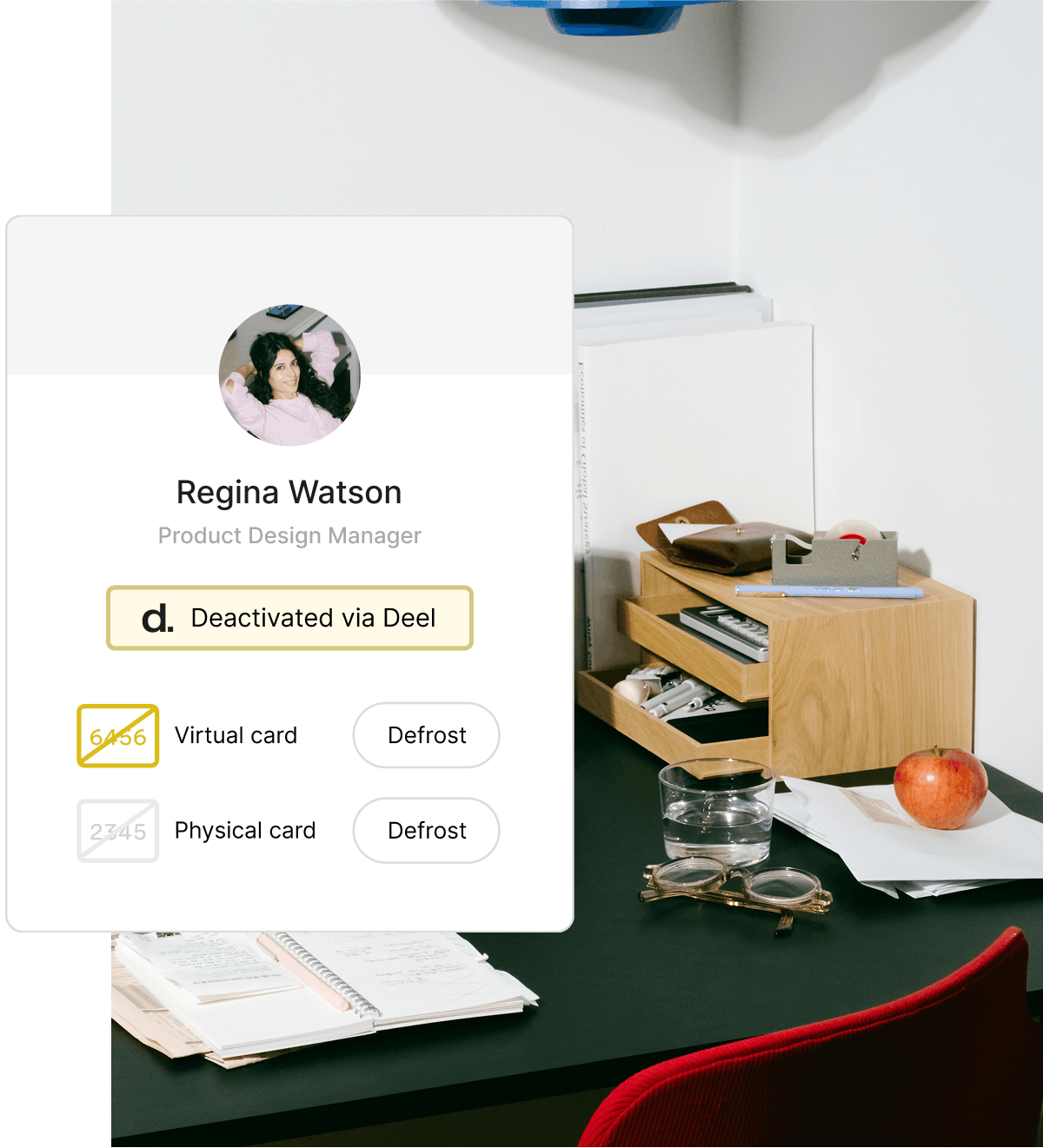 Someone leaves? Pleo freezes their card the moment they’re marked inactive in Deel. Forget about the unnecessary risk of post-departue spend and manual follow-ups.