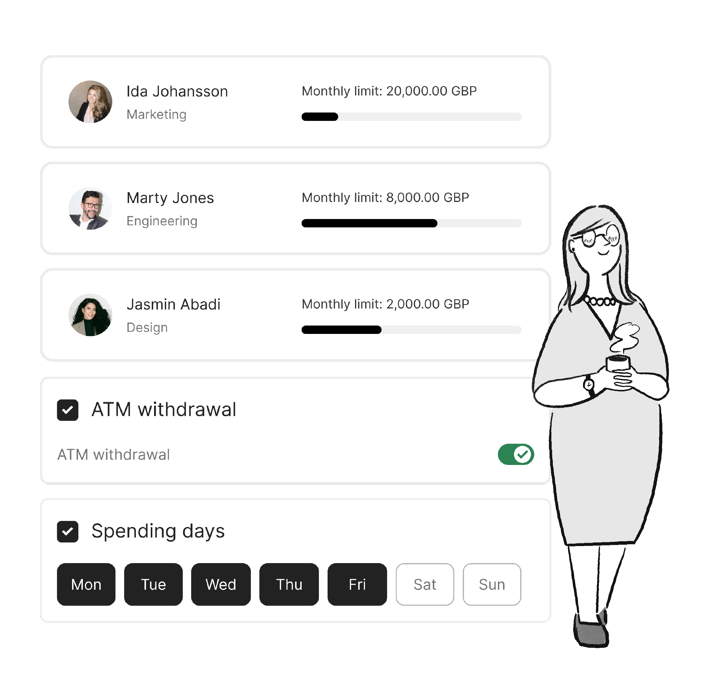 Set guardrails to make all spend compliant. Apply customisable spending limits, vendor-specific, ATM or time-based card restrictions for every employee so you can control spending before it happens.