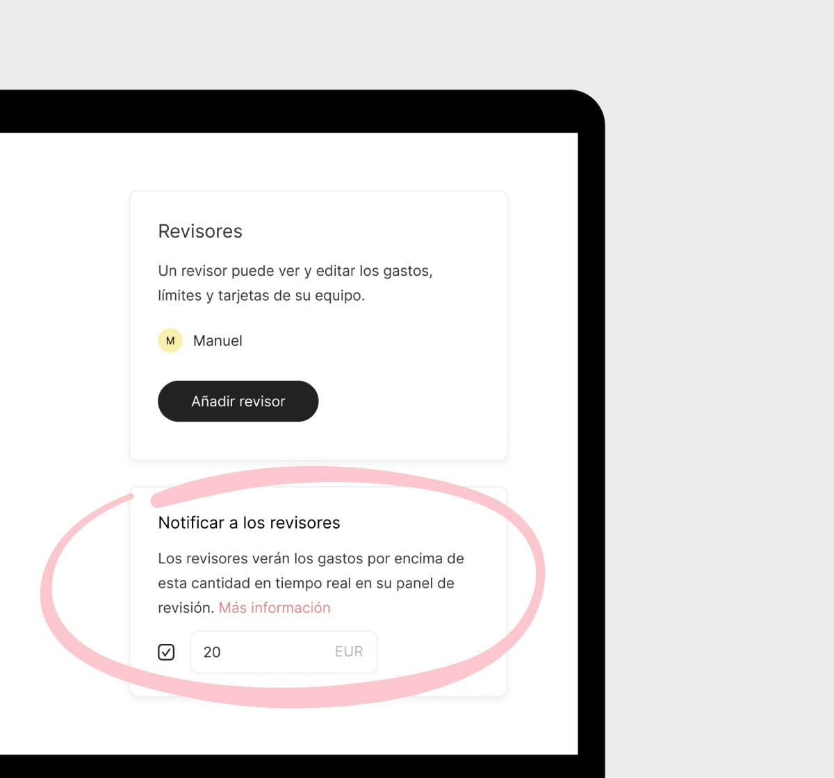 Establece un umbral de revisión para tu equipo: si gastan por encima, se notificará a los responsables. Podrán decidir con un solo gesto si el gasto es correcto.