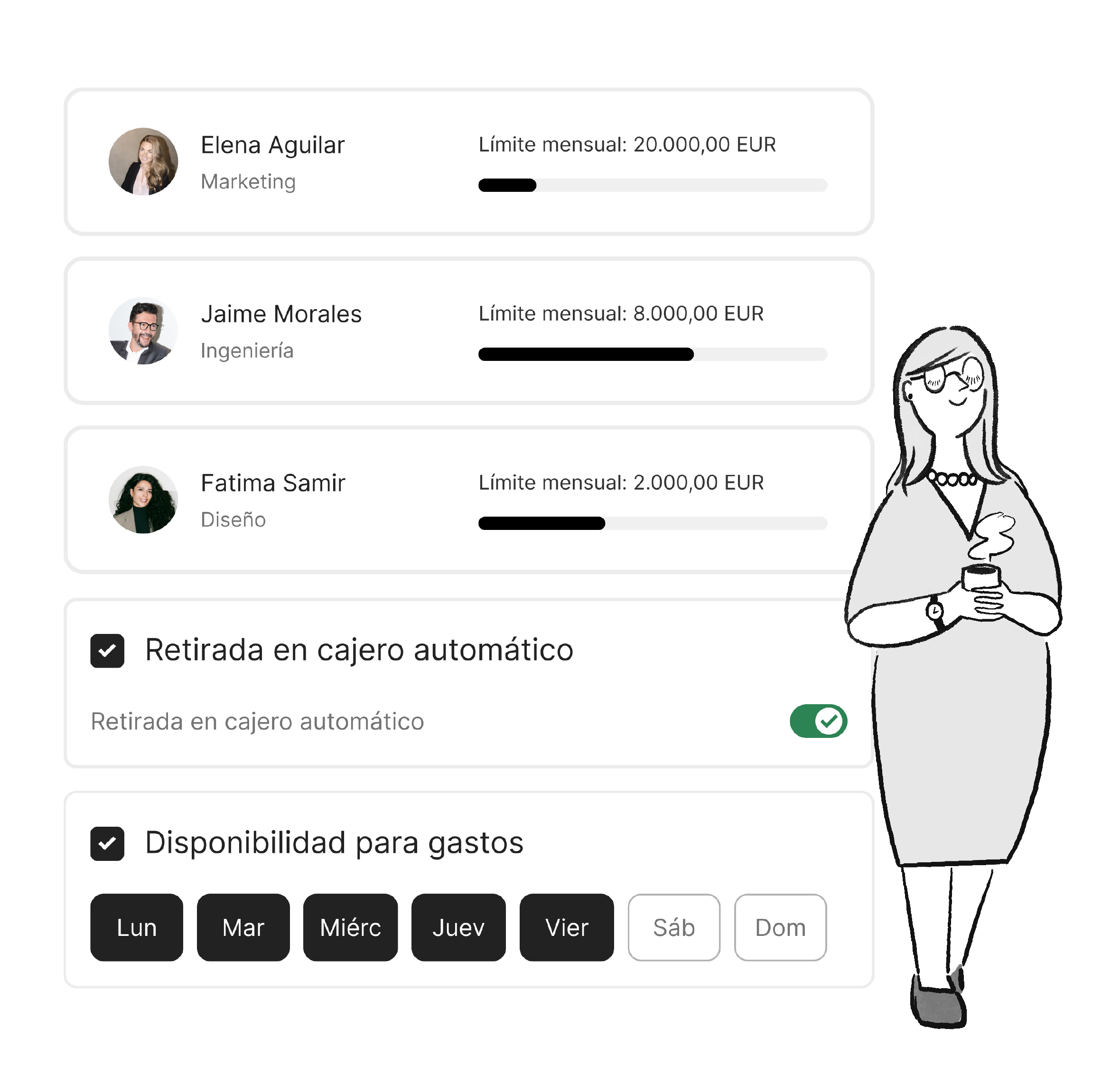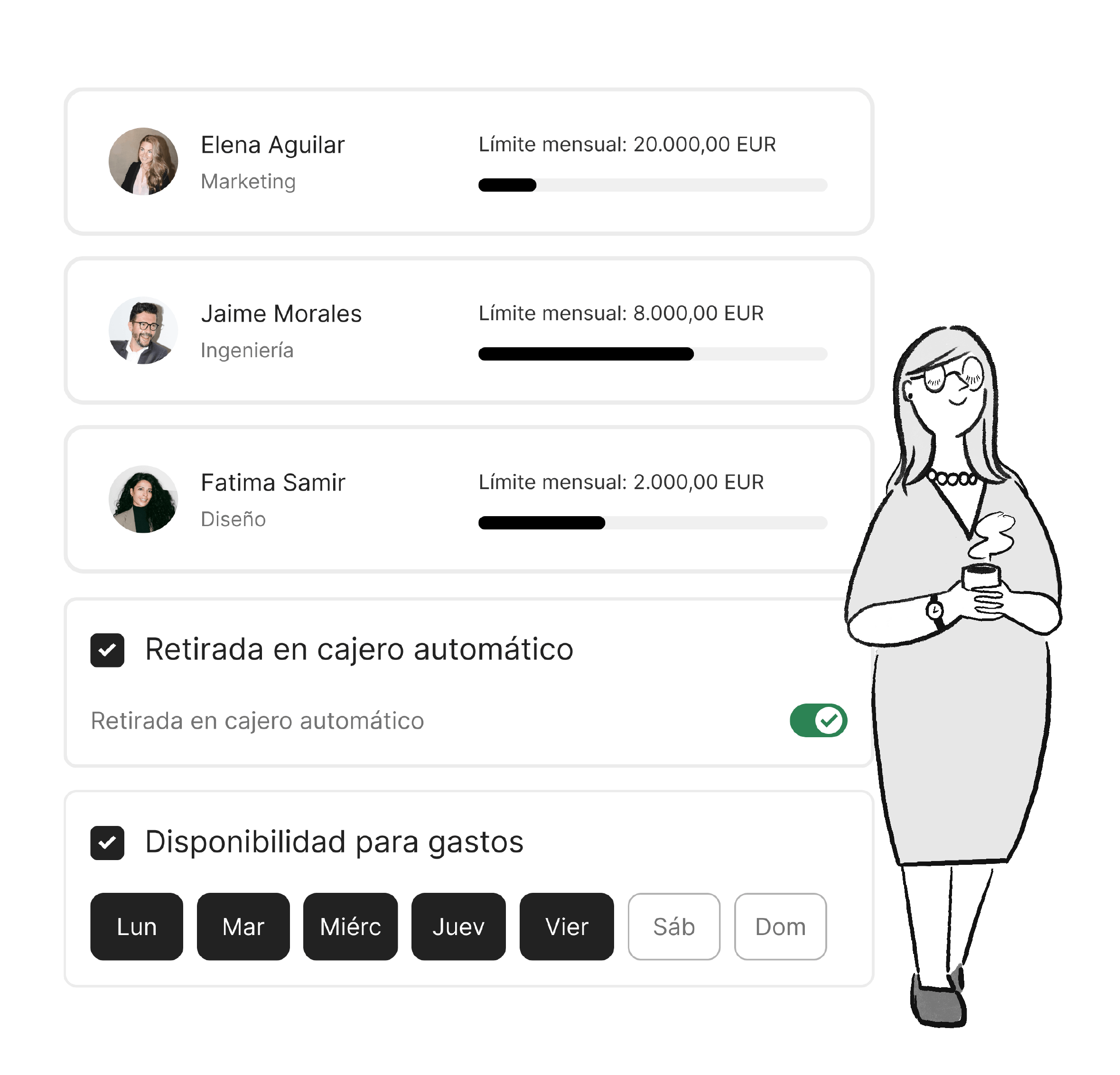 Personaliza el límite de gasto para cada empleado, desde límites mensuales y totales hasta límites por compra o temporales.