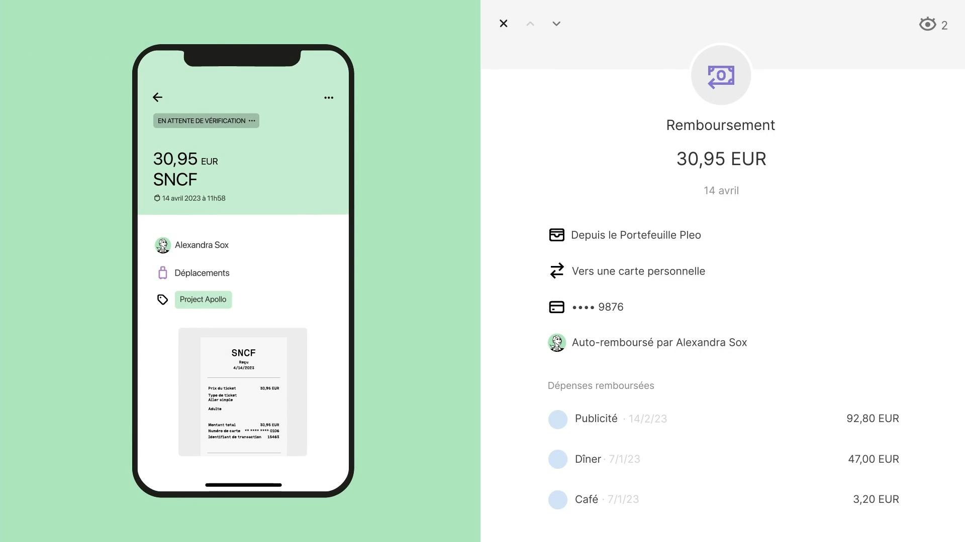 Un collaborateur qui fait un achat avec son propre argent peut facilement ajouter ses dépenses dans l’application Pleo. Le responsable ou l'équipe finance peut ensuite vérifier et autoriser les remboursements. Une fois qu’un remboursement a été approuvé, le collaborateur reçoit une notification l’informant que l’argent lui a été transféré (à condition qu’il ait préalablement indiqué ses coordonnées bancaires). Le suivi et l’enregistrement de la dépense et du remboursement s’effectuent sur la plateforme, comme pour n’importe quel achat effectué avec une carte Pleo.
