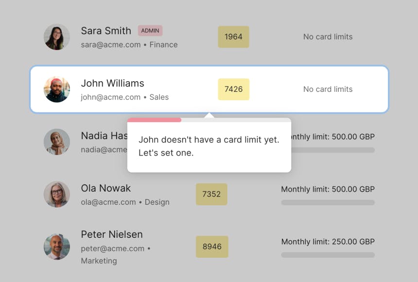 Get an overview of cardholder activity, invite new team members, and remove cards in seconds.