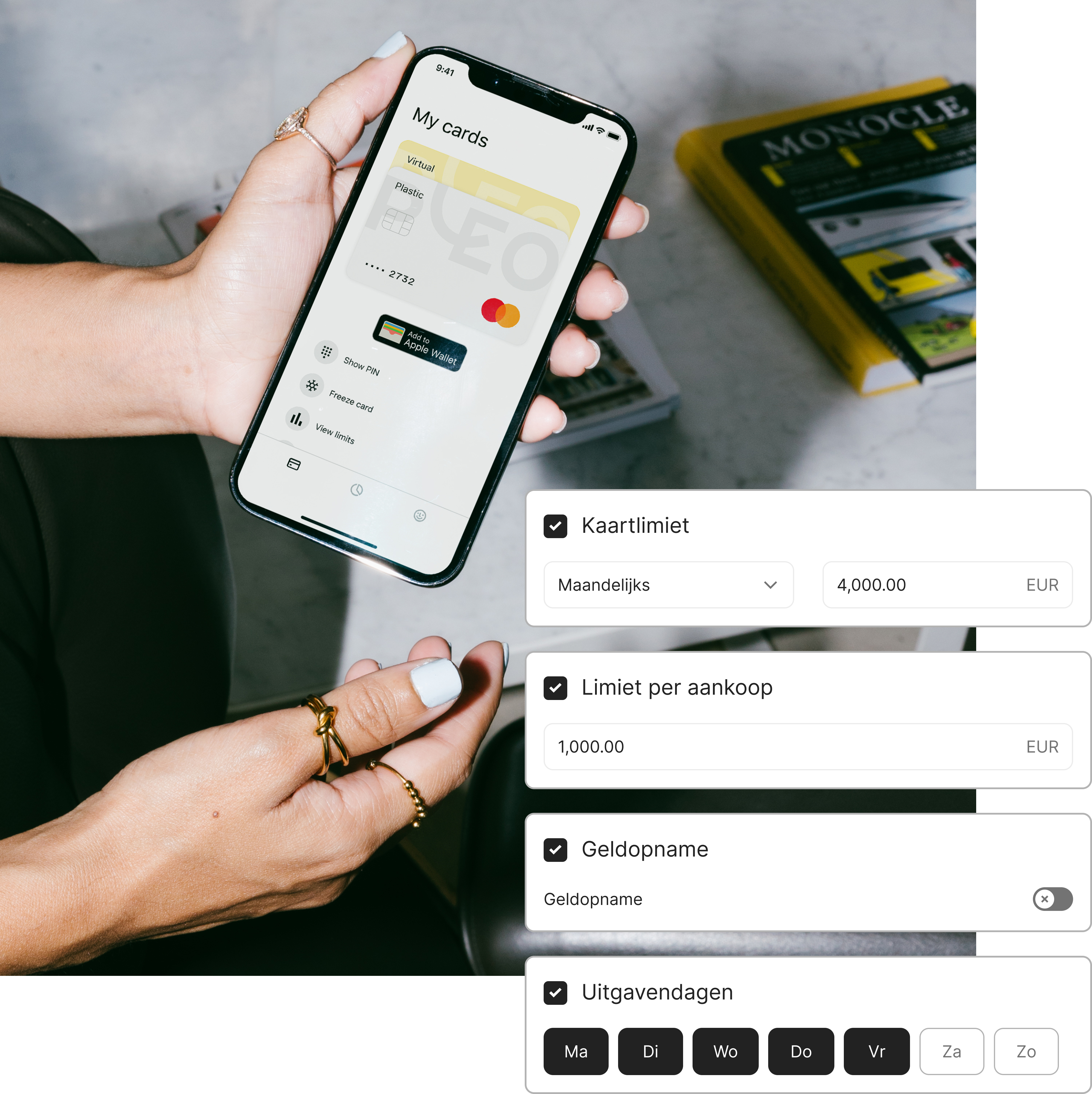 Geef fysieke, virtuele of tijdelijke kaarten uit voor hardware, abonnementen of meer. Voorgeschoten uitgaven zijn niet langer nodig en elke transactie wordt direct in de app geregistreerd. Zou houd je altijd grip op je uitgaven.