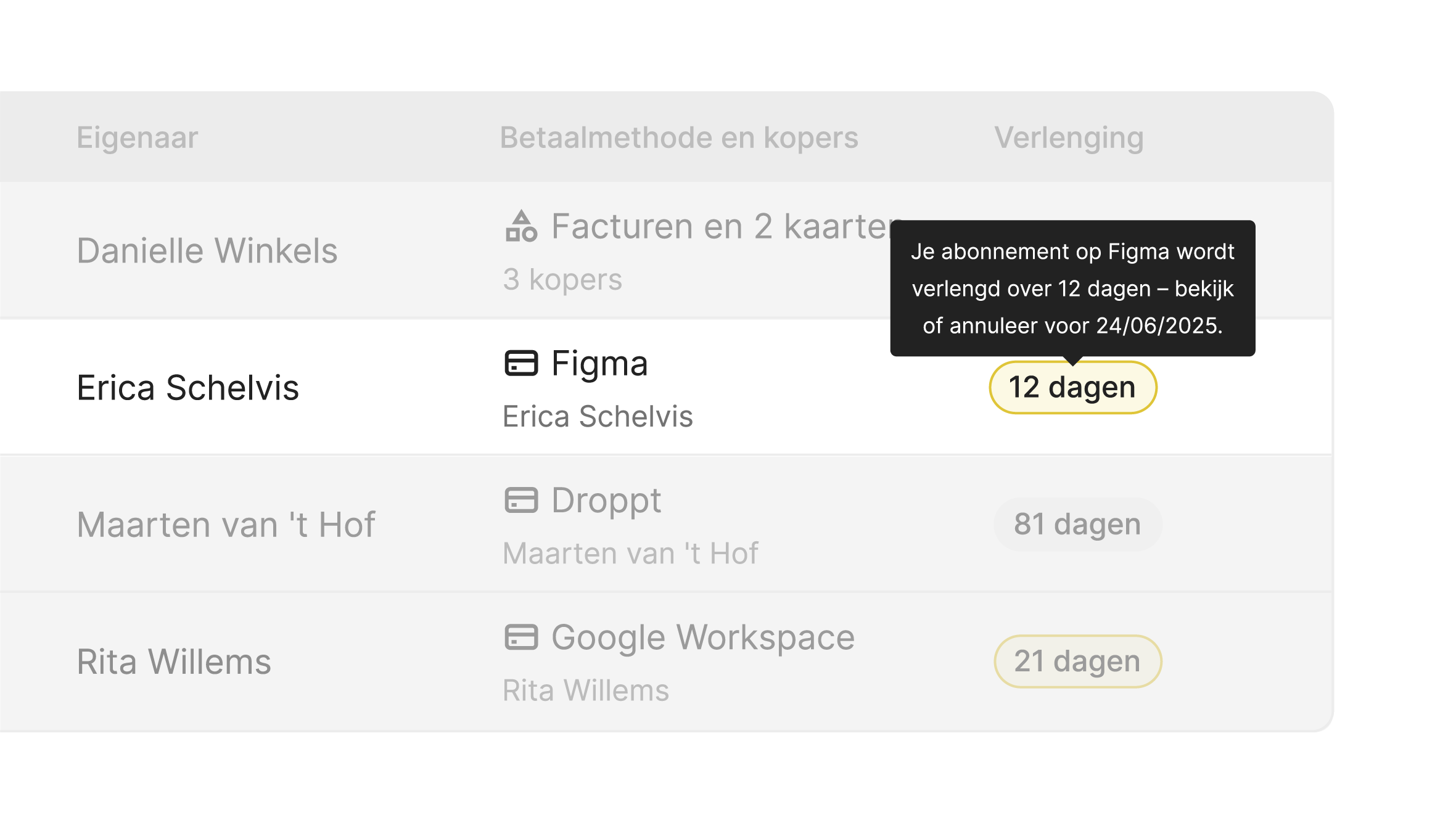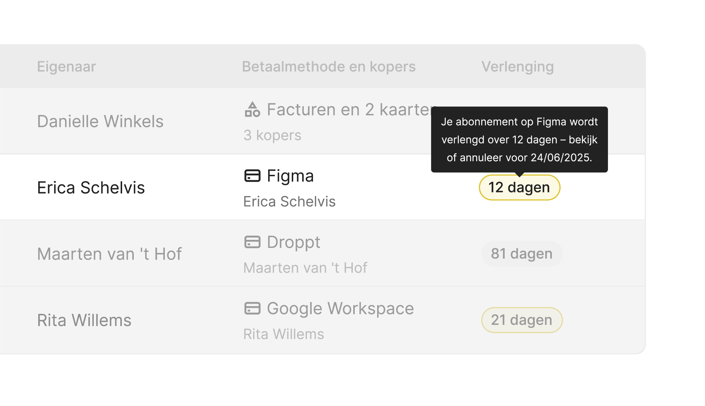 Detecteer automatisch terugkerende SaaS-uitgaven van bedrijfskaarten en facturen in één centraal dashboard en voorkom onvoorziene IT-kosten.