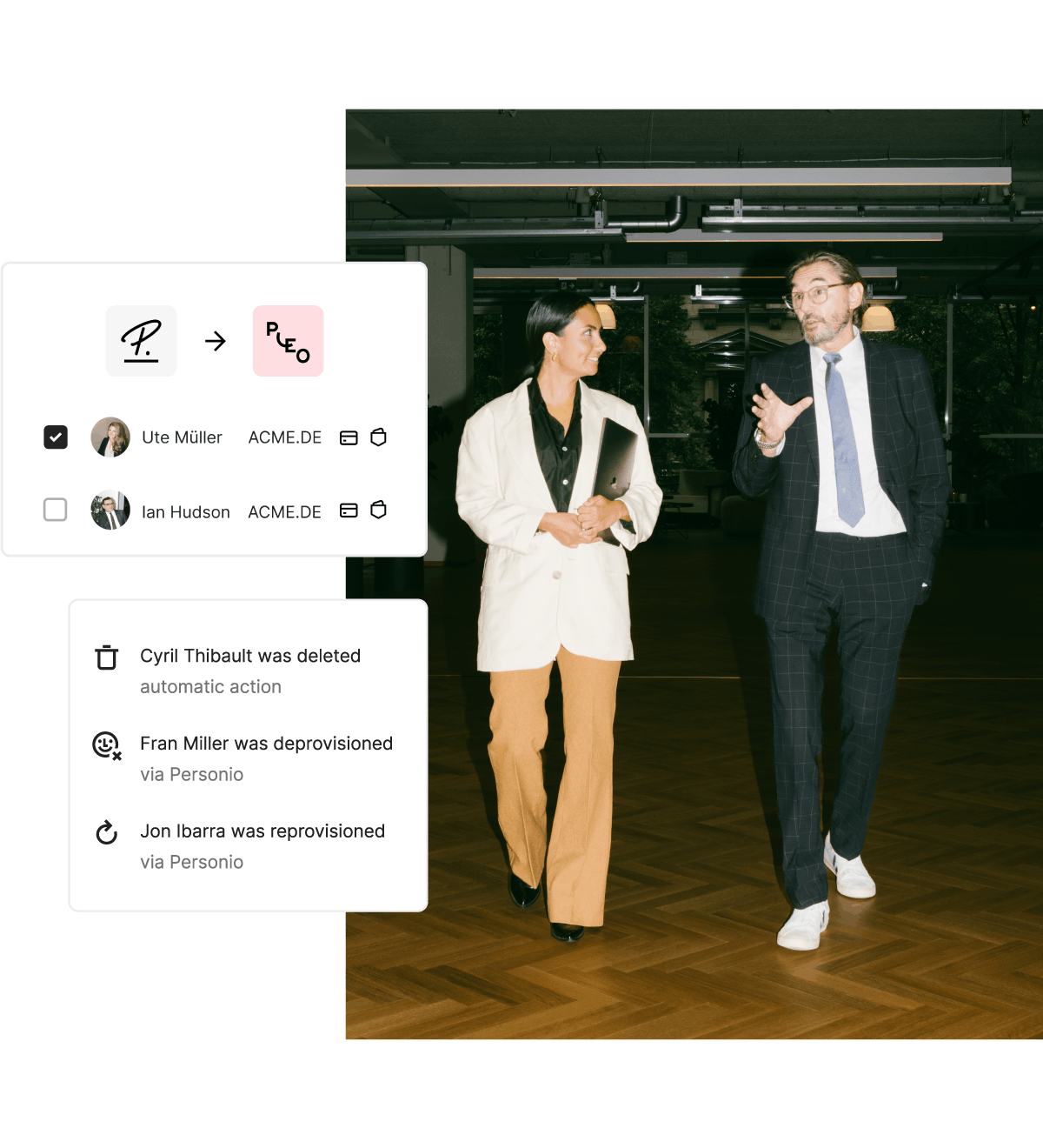 Minska manuell administration genom att synka dina medarbetare i olika system. Med våra HR- och IdP-integrationer kan du säkert lägga till medarbetare i Pleo och automatiskt inaktivera dem när de slutar. Ett enkelt sätt att behålla kontrollen under tillväxt.