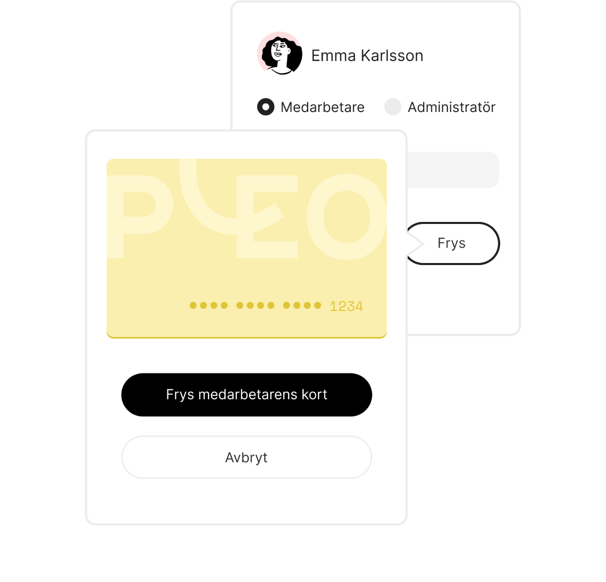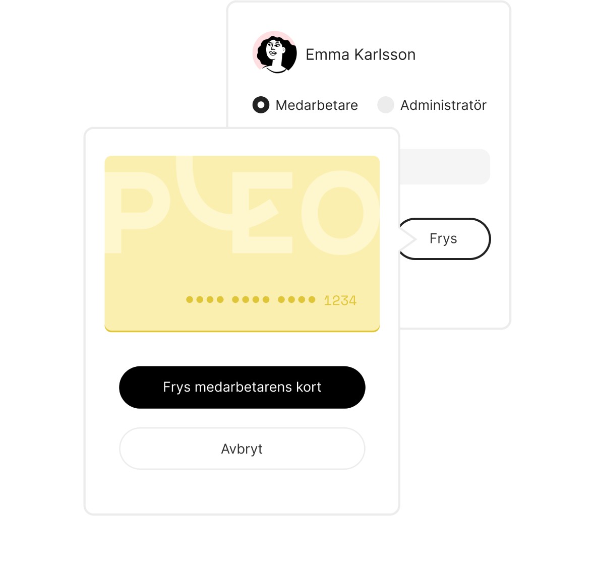 Såg du några icke godkända betalningar eller potentiellt bedrägeri? Inga problem. Det är enkelt att frysa Pleo-kort. Och om en medarbetare lämnar företaget raderas hen som användare i Pleo på några skunder, och kortet blockeras.