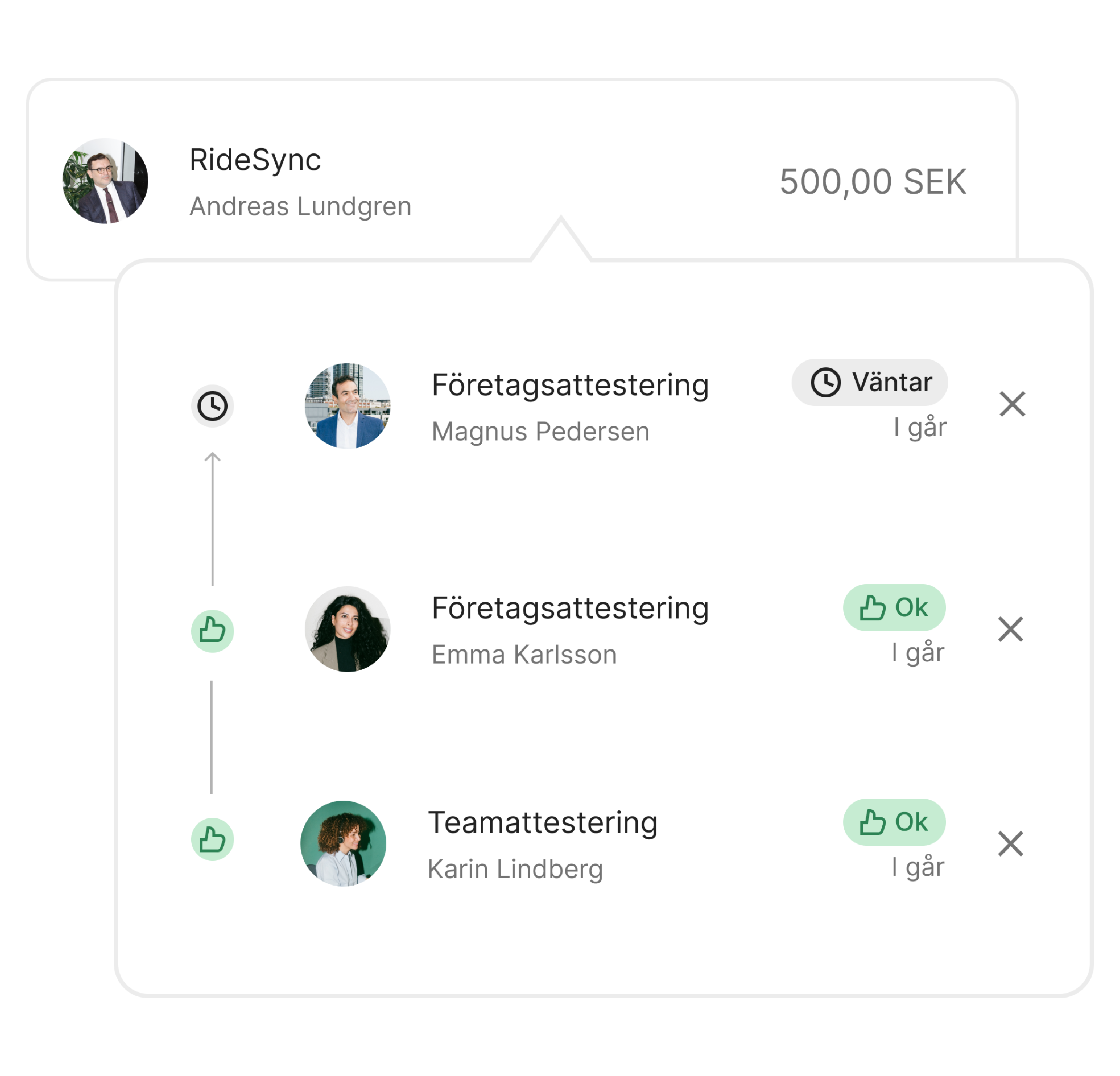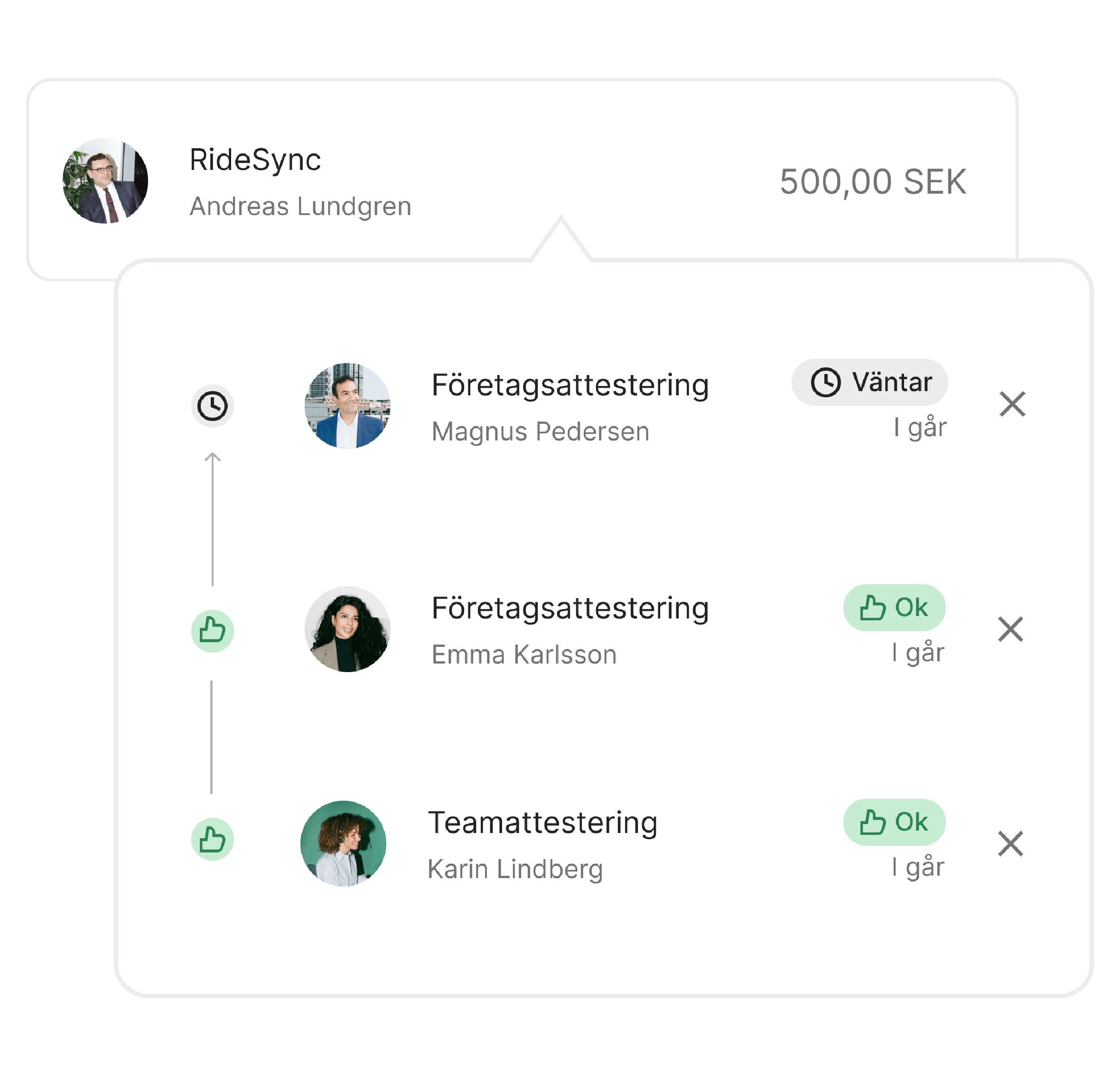Upptäck utgifter utanför policyn med flexibla attestflöden. Attestera och godkänn kortutgifter och utbetalningar av utlägg på ett och samma ställe. Helt utan manuellt arbete och röriga mailtrådar.