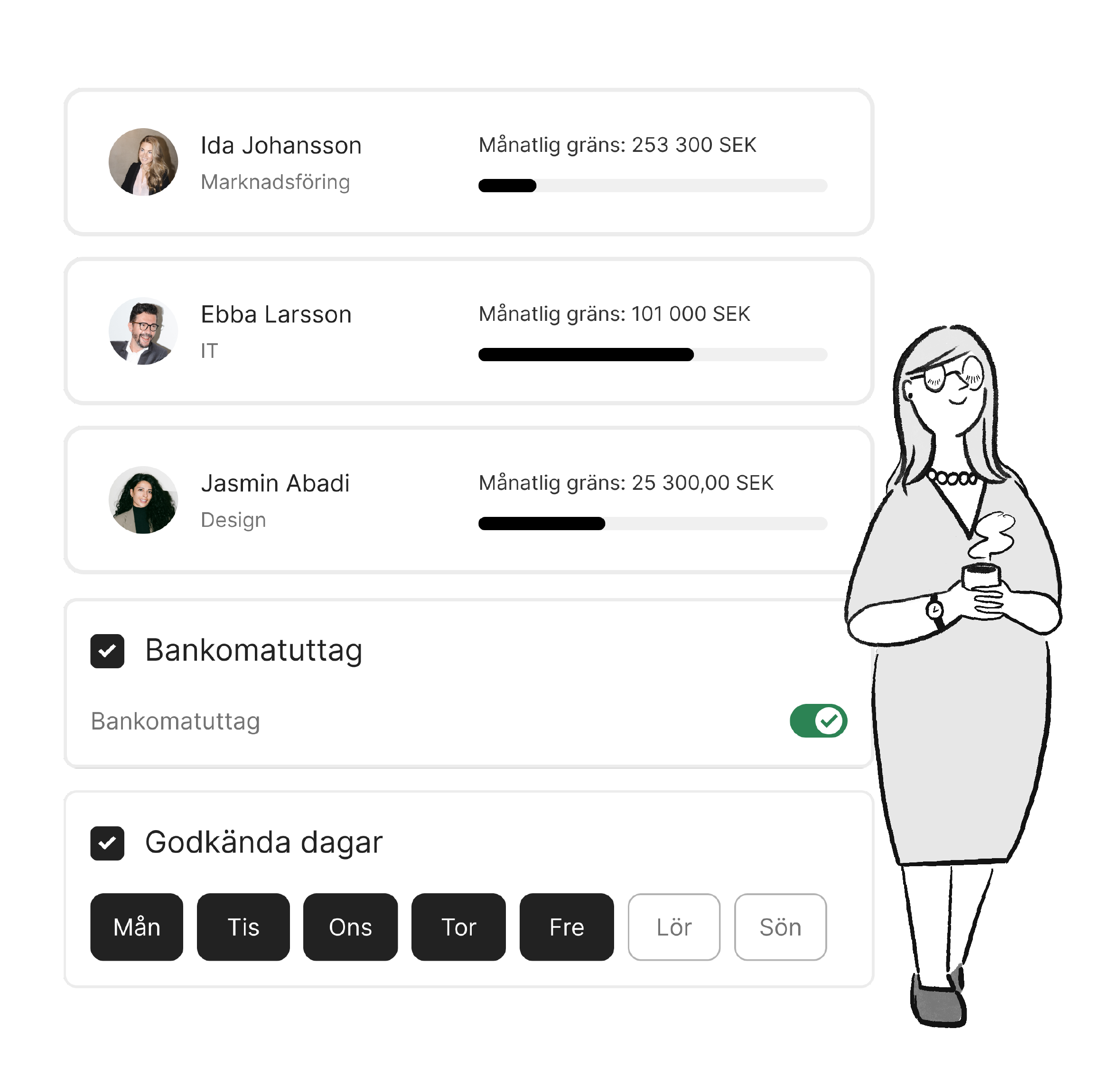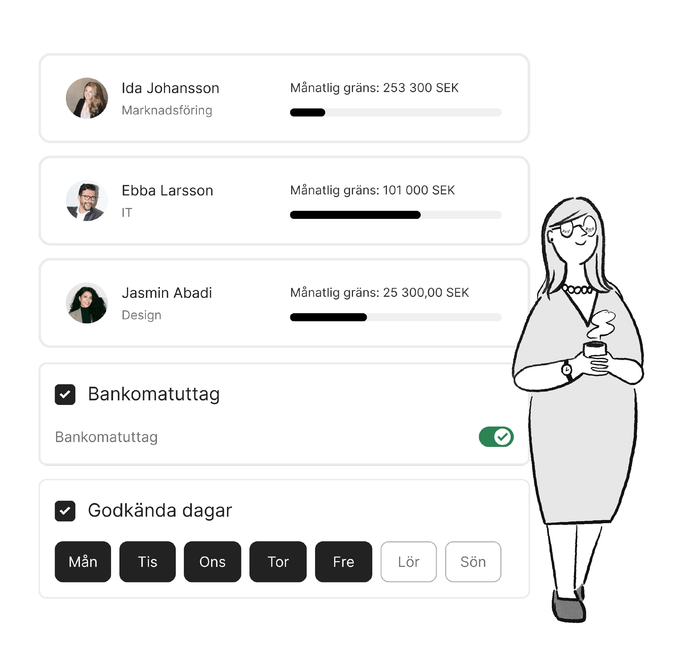 Anpassa köpgränser för varje medarbetare – totalt, månatligt, individuellt och tillfälligt.